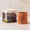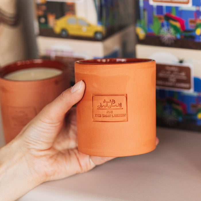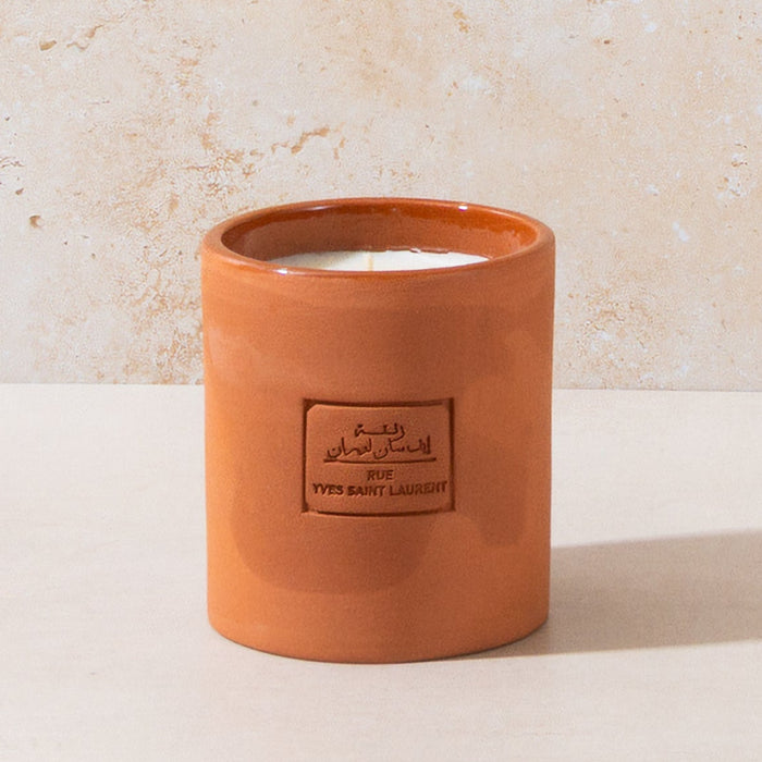 ‘Rue Yves Saint Laurent’ scented candle in a hand-made terracotta pot, as part of the Marrakech series of candles by Moroccan brand Cote Bougie.
