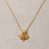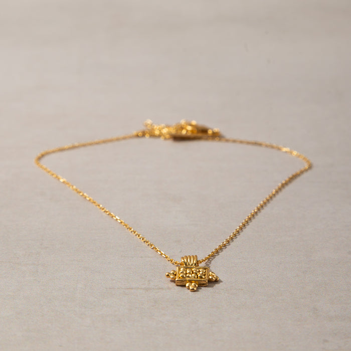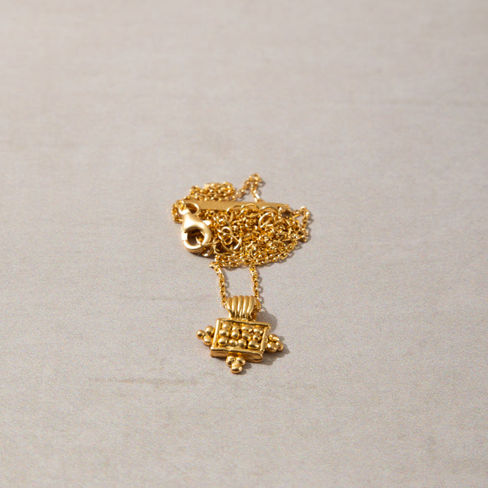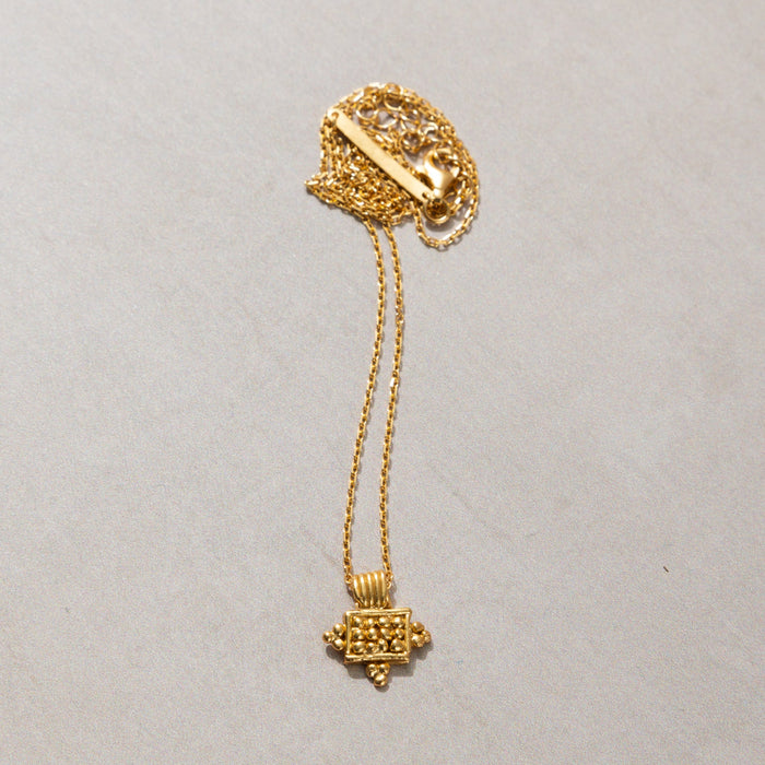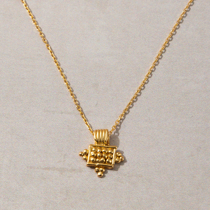 The 'Bauhaus' pendant is a small gold pendant with rectangular centre filled with small baubles. Inspired by the Bauhaus art and design movement, founded in 1919 which merged art and industry - Its ideas and influence touched all areas from fashion to theatre to architecture.