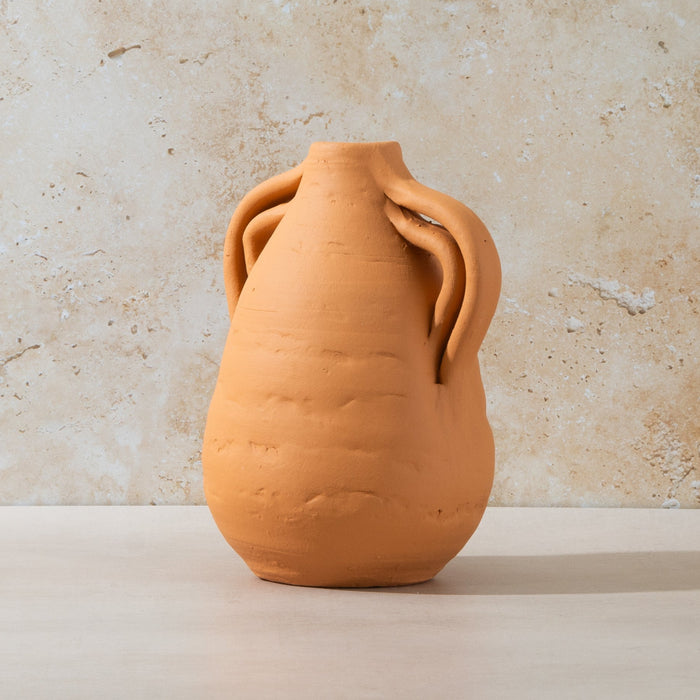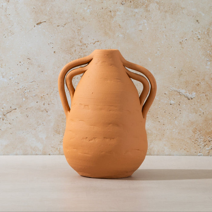 Conical terracotta vase with double handle detail, by Portuguese based Oito Atelier. Each of these pieces has been hand-made, which is reflected in the beautiful uneven texture to the surface of each piece.
