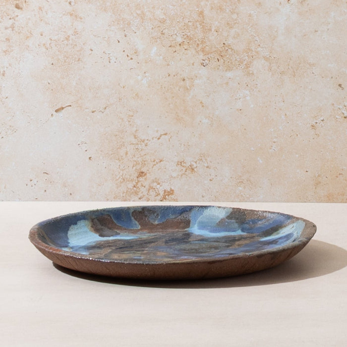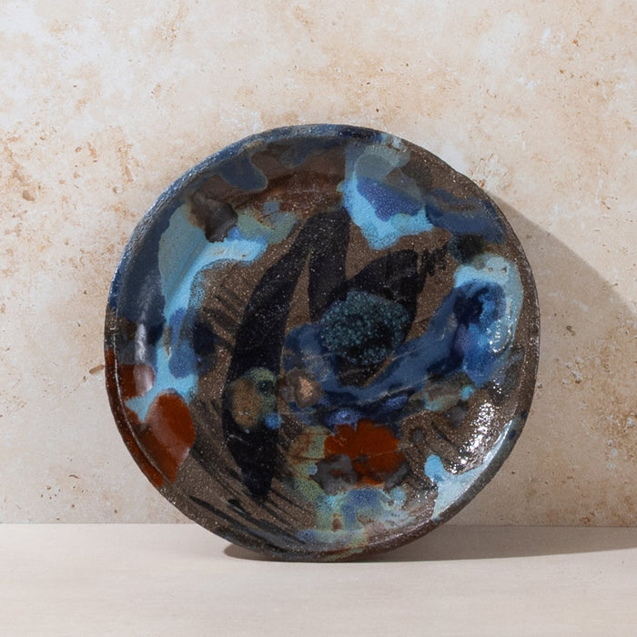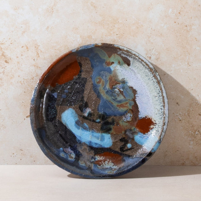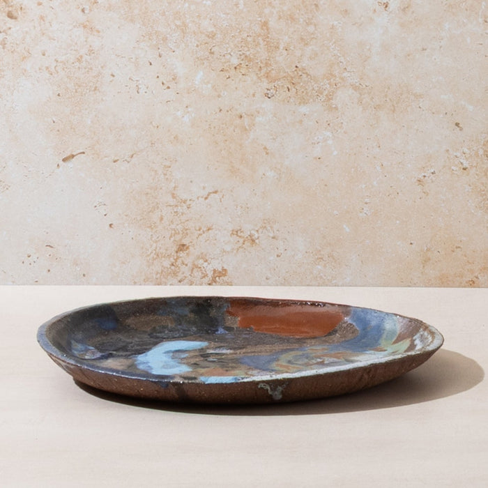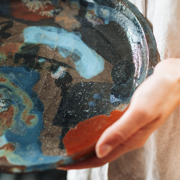 One-of-a-kind statement deep plates from part of the Kana London 'Emotional Landscapes' collection - A collection of pieces which have been expressively hand-painted by Kana London's founder and artist Ana Kerin. Made from a dark sand toned coloured softly textured clay with mixed colour markings, these pieces are tactile and inviting.
