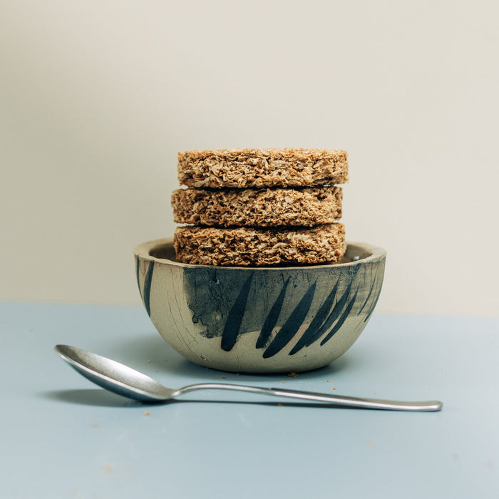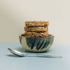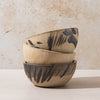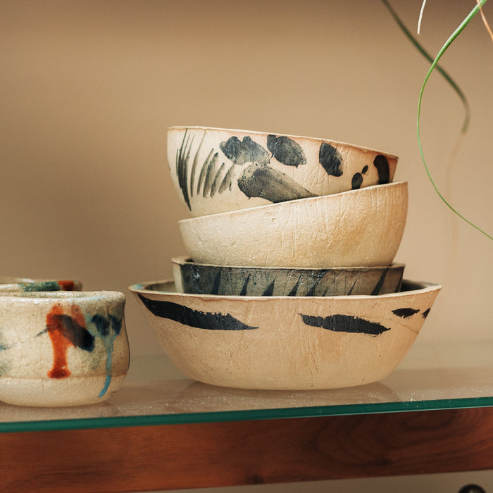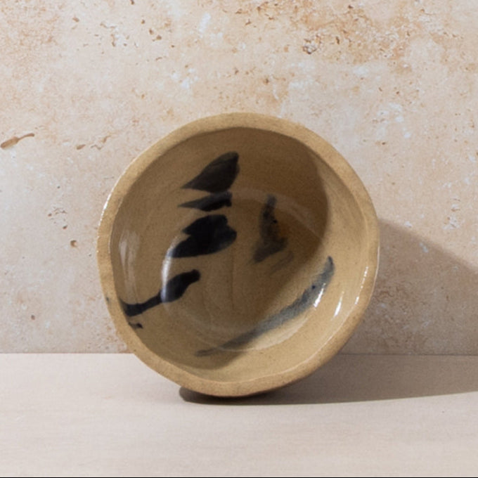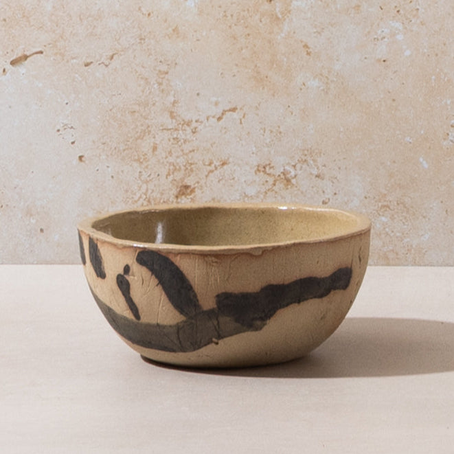 Tall breakfast bowl from part of the Kana London 'Beautiful Mess' collection - A collection of pieces which have been expressively hand-painted by Kana London's founder and artist Ana Kerin, making each piece one-of-a-kind. Made from a mid-golden sand toned coloured softly textured clay with black markings, these pieces are tactile and inviting.