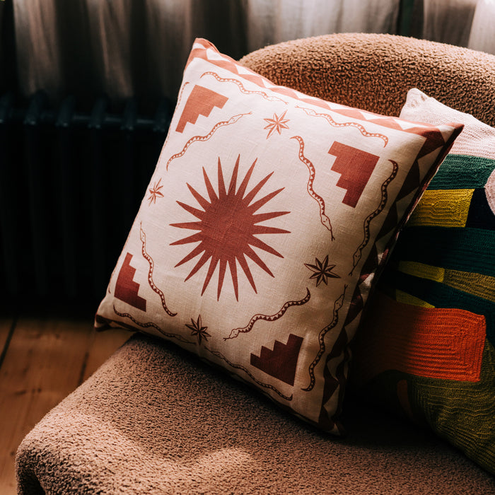 'Sun' cushion cover by UK based Printed Goods, with a rust and cream illustrated design printed onto heavyweight premium linen.